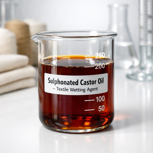 Sulphonated Castor Oil is a modified castor oil made by treating castor oil with sulphuric acid, which introduces sulphonate/sulphate groups and makes the oil water-dispersible. Because it behaves as an anionic surfactant, it helps oil and water mix, stabilizes emulsions, and improves wetting in aqueous processing baths.